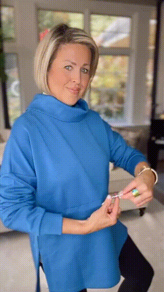- Turtleneck, long sleeve, drawstring waist, side slit